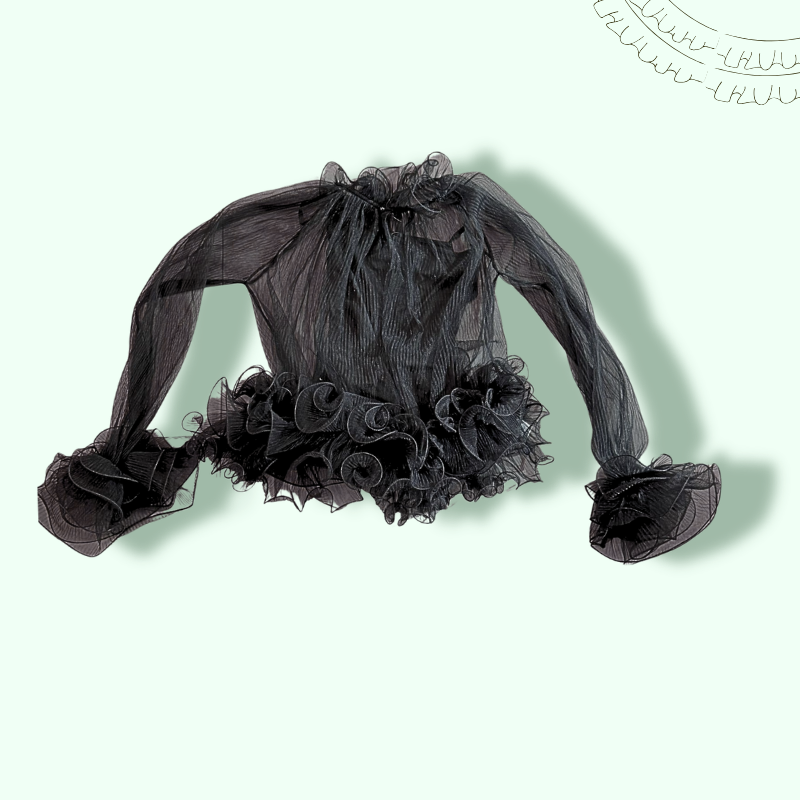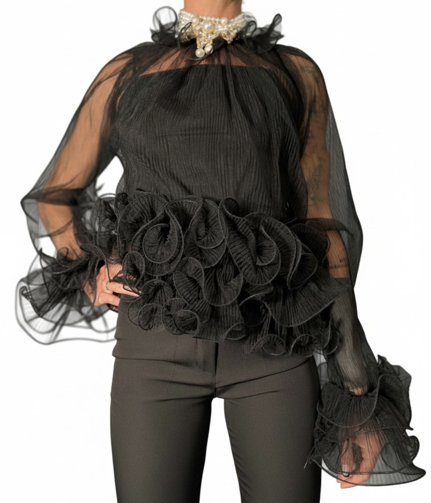 CAMICIA NERA TRASPARENTE IN TULLE CON VOLANT IN VITA E SUI POLSI: LEGGERA COME UNA NUVOLA, ELEGANTE COME UNA REGINA!!