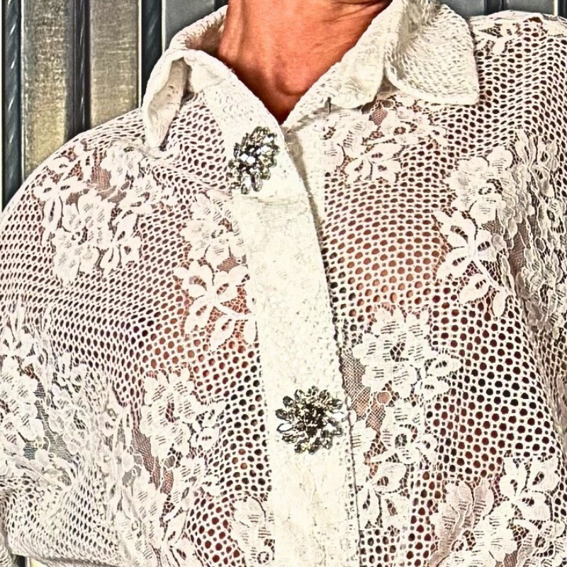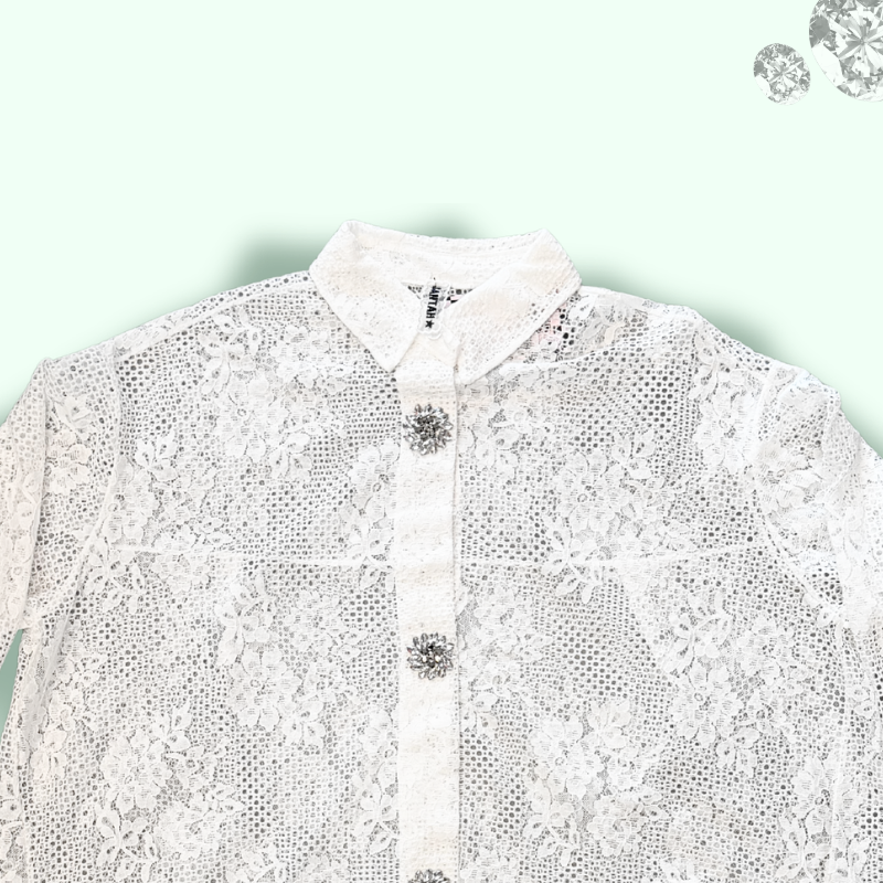 CAMICIA BIANCA TRAFORATA E PIZZATA A MANICA LUNGA CON BOTTONI GIOIELLO: LUCIO FONTANA AVREBBE AMATO QUESTA CAMICIA, QUI I TAGLI DIVENTANO TRAFORI ELEGANTI E PREZIOSI. TI FARA’ SENTIRE IN VACANZA A CAPRI ANCHE SE SEI IN PIENO CENTRO CITTA’… E NON DI MARE!