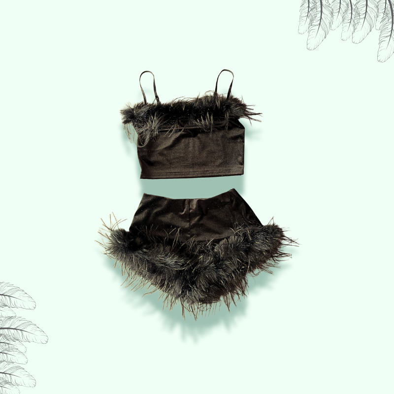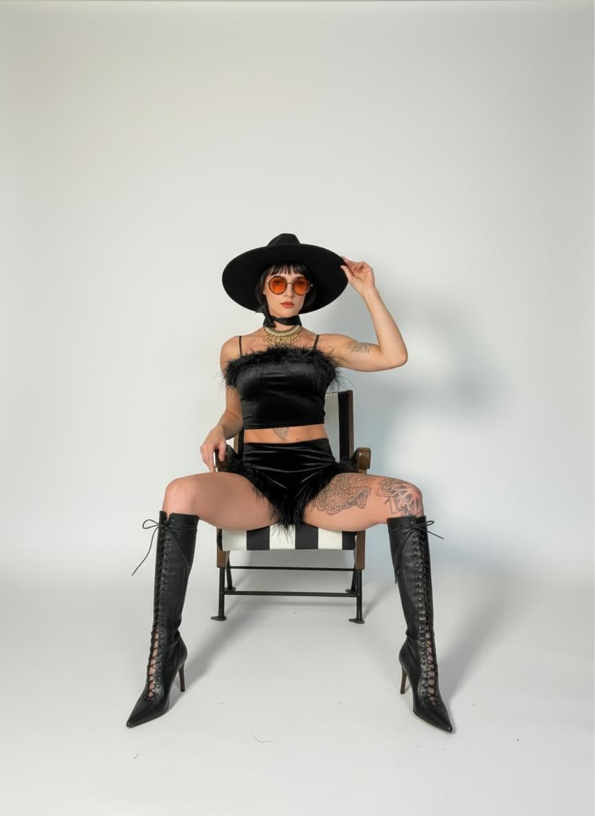 COMPLETO-COORDINATO SHORT E TOP NERO VELLUTATO CON PIUME: NON È UN SEMPLICE COORDINATO, È UN MANIFESTO DI POTERE. È IL LOOK PERFETTO PER LA DONNA SANTAH CHE AMA IL FASCINO DELLE DIVE DI ALTRI TEMPI MA CON UN’ATTITUDINE DECISAMENTE CONTEMPORANEA E “CATTIVA”. ABBINALO AI NOSTRI STIVALI STRINGATI SANTA EVA PER UN LOOK CHE NON LASCIA SCAMPO.