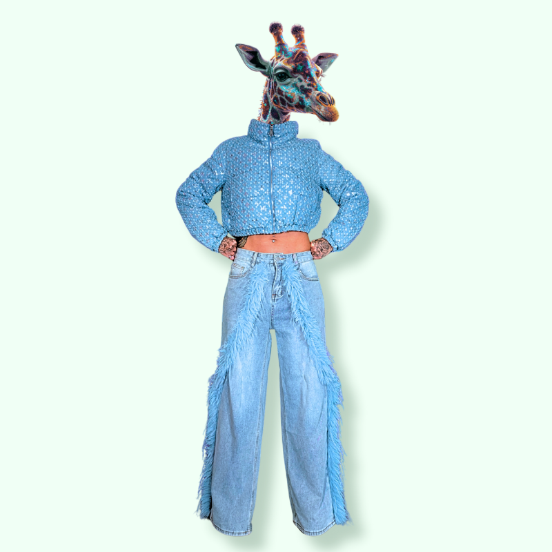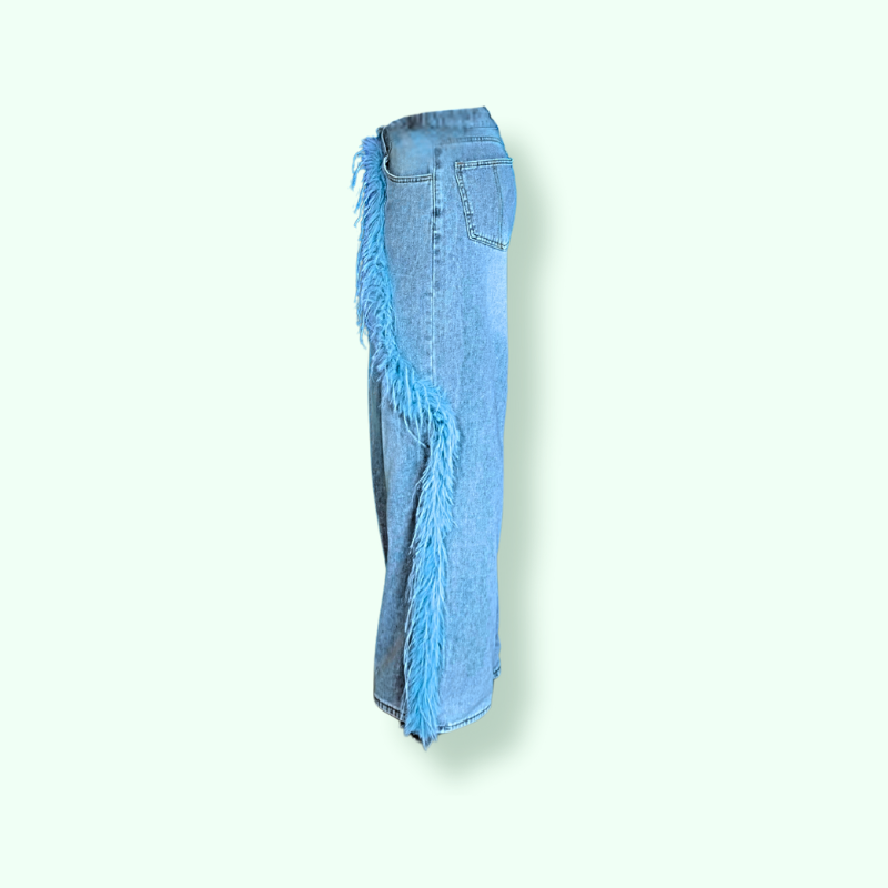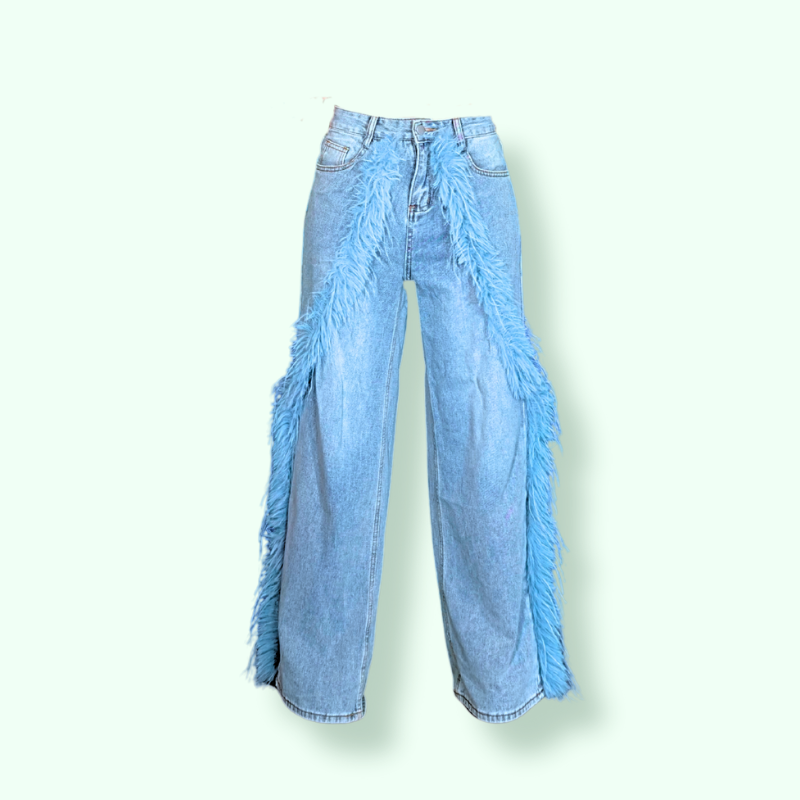 JEANS CHIARO A PALAZZO CON APPPLICAZIONE DI PIUME: UNA VERA PAVONA PRONTA A PAVONEGGIARSI.