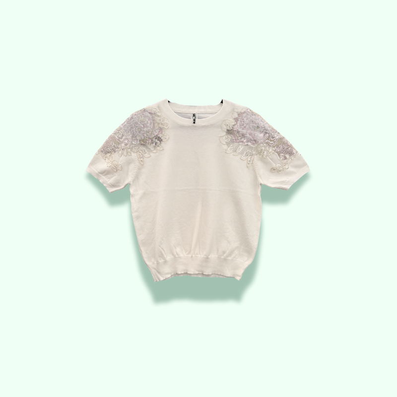 MAGLIA MANICA CORTA CON APPLICAZIONE TRASPARENTE E BRILLANTE SULLE SPALLE: SPUMEGGIANTE DI GIORNO FRIZZANTINA DI SERA.