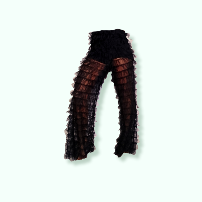 PANTALONE A BALZE IN TULLE TRASPARENTE. SVOLAZZANTE COME UNA GONNA, PRATICO COME UN PANTALONE… PRATICAMENTE UNA NUVOLA CHE CAMMINA!