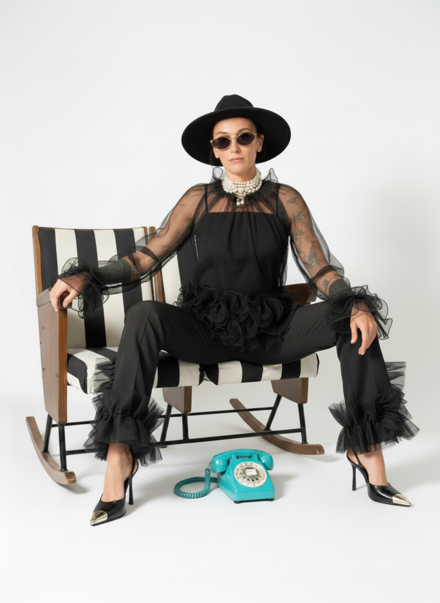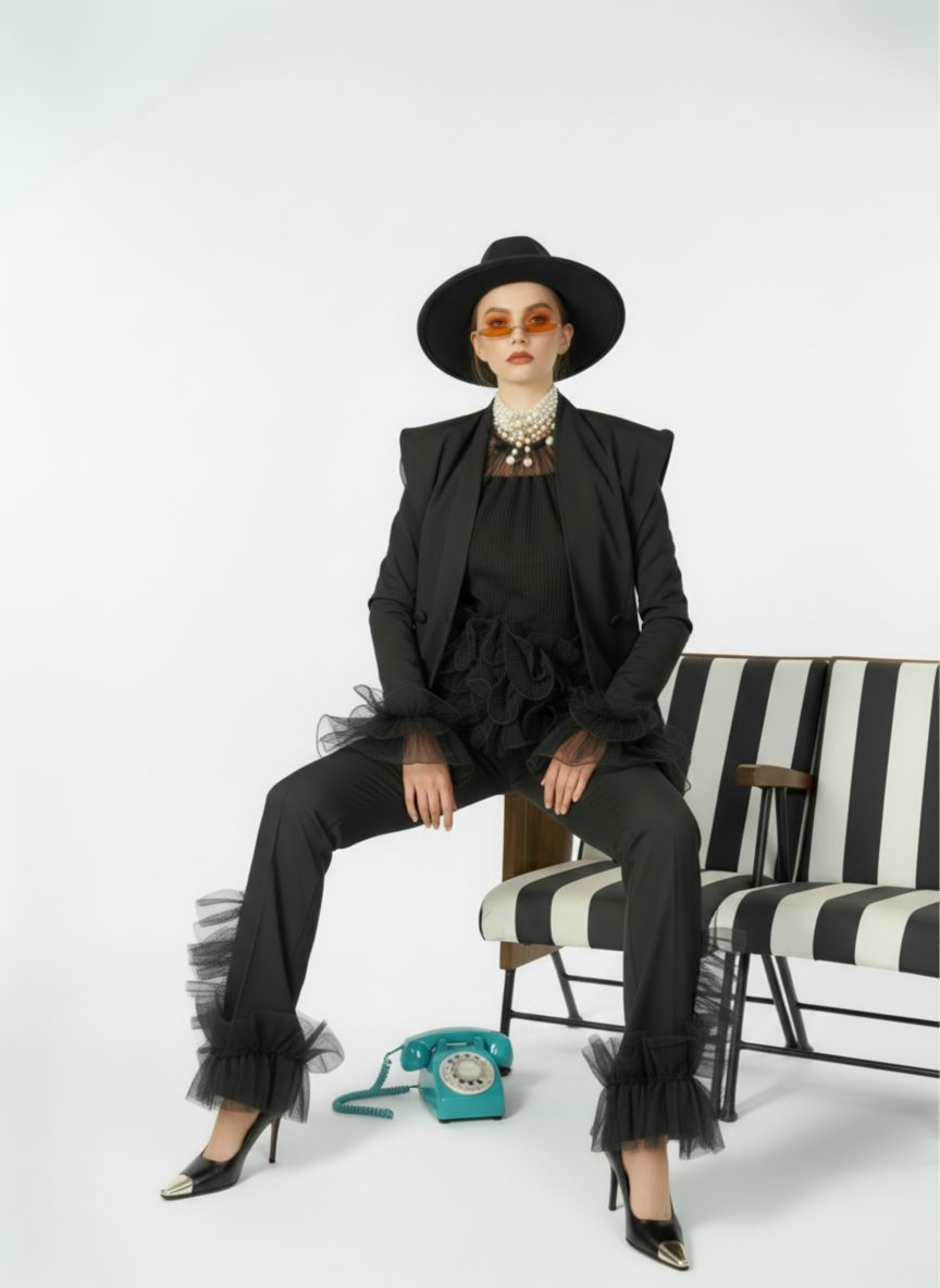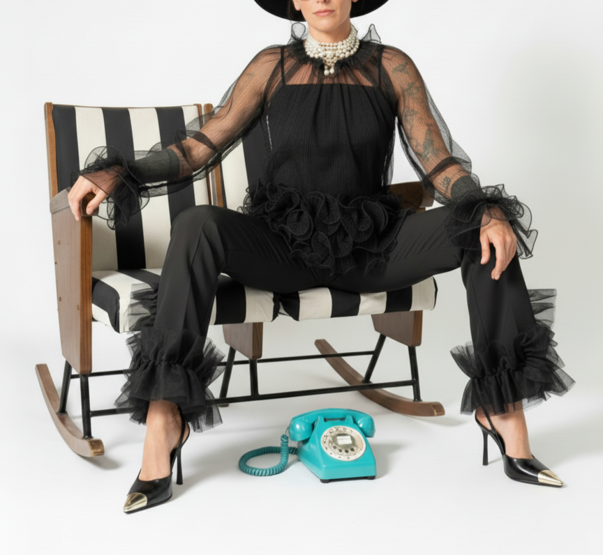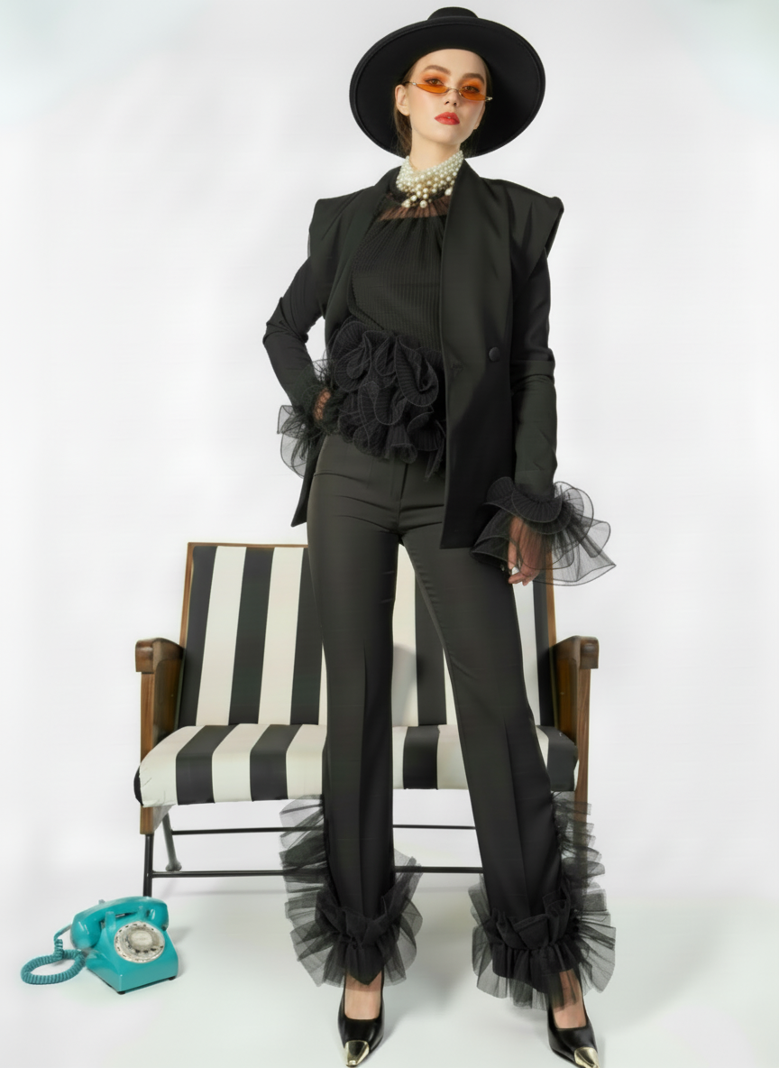 PANTALONE CLASSICO A ZAMPA CON APPLICAZIONI IN TULLE SUL FONDO: PRONTA PER IL TUO PRIMO SPETTACOLO DI FLAMENCO CON ELEGANZA.